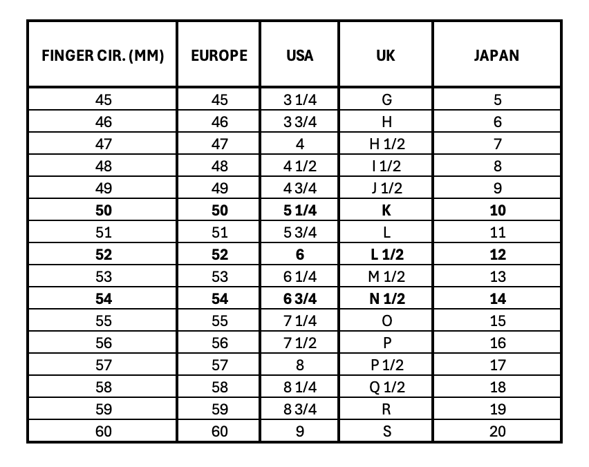 5. Find the Ring Size: Using the ring size chart below, convert the circumference measurement to a ring size. This will show you the corresponding ring size for various circumferences.